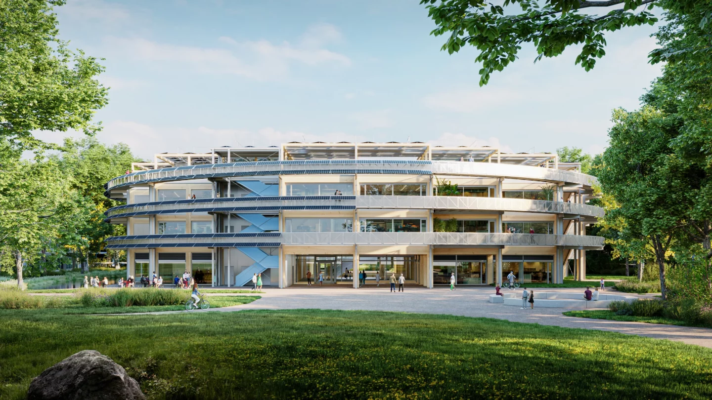 Die Gebäudehülle spielt eine zentrale Rolle für die energetische Effizienz des Hubs. Während im Erdgeschoss und im Dachgeschoss eine Pfosten-Riegel-Fassade aus Aluminium eingesetzt wird, kommen in den Regelgeschossen großformatige, vorgefertigte Fensterelemente mit integrierter dezentraler Lüftung zum Einsatz. Diese Elemente gewährleisten eine effiziente natürliche Belüftung und tragen zur nachhaltigen Betriebsweise des Gebäudes bei. Die Primärstruktur ist eine Holz-Beton-Hybridstruktur. Heiz-Kühldecken und PV-Paneele sowie die Anbindung an ein Nahwärmenetz helfen, den ökologischen Fußabdruck zu minimieren.