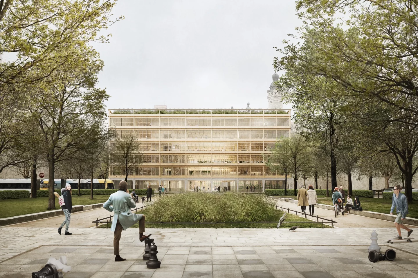 Der fünfstöckige Neubau ist als Holz-Verbundkonstruktion vorgesehen. Er erhält eine Gebäudehülle aus vorgefertigten, ca. 7,5m breiten Holzrahmenelementen. In diese ist ein Fenstersystem eingebunden, dass die Öffnungsflügel und in Teilen die Festverglasung umfasst. Die Brüstungen und die vertikalen Lisenen sind hinterlüftet und mit einer Holzschalung versehen. Die Gesimse fungieren als geschossweise Brandriegel und bilden einen Witterungsschutz für die Fassade aus. Brüstung, Sturz und Lisenen bilden die opaken und hochgedämmten Fassadenanteile, die eine im übrigen sehr transparente Gebäudeerscheinung ermöglichen. Der Sonnenschutz wird durch einen außenliegenden Raffstore sichergestellt.Im Erdgeschoss bildet eine Pfostenriegelfassade den Raumabschluss. Die opaken Bauteile des EG sind mit Naturstein verkleidet.