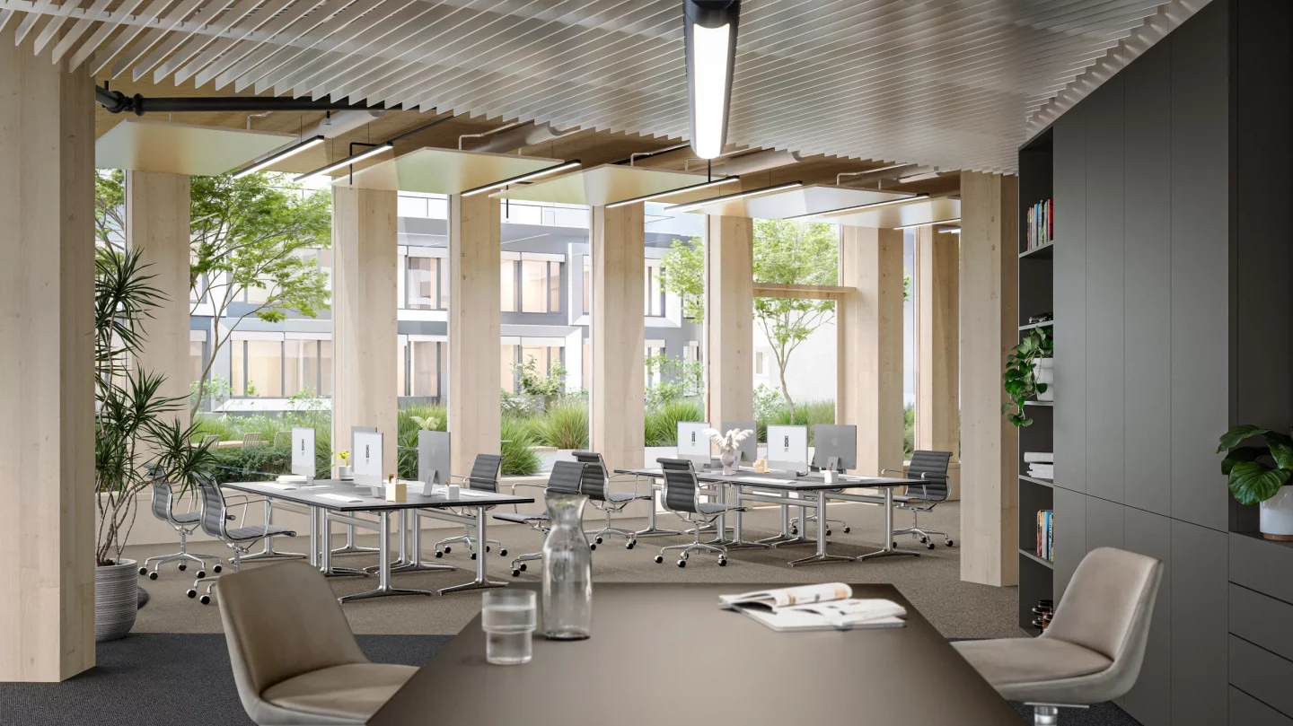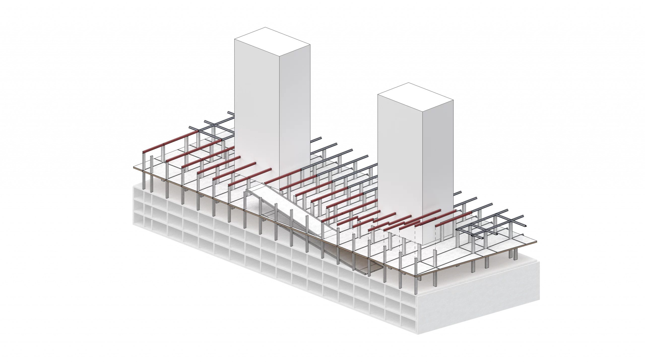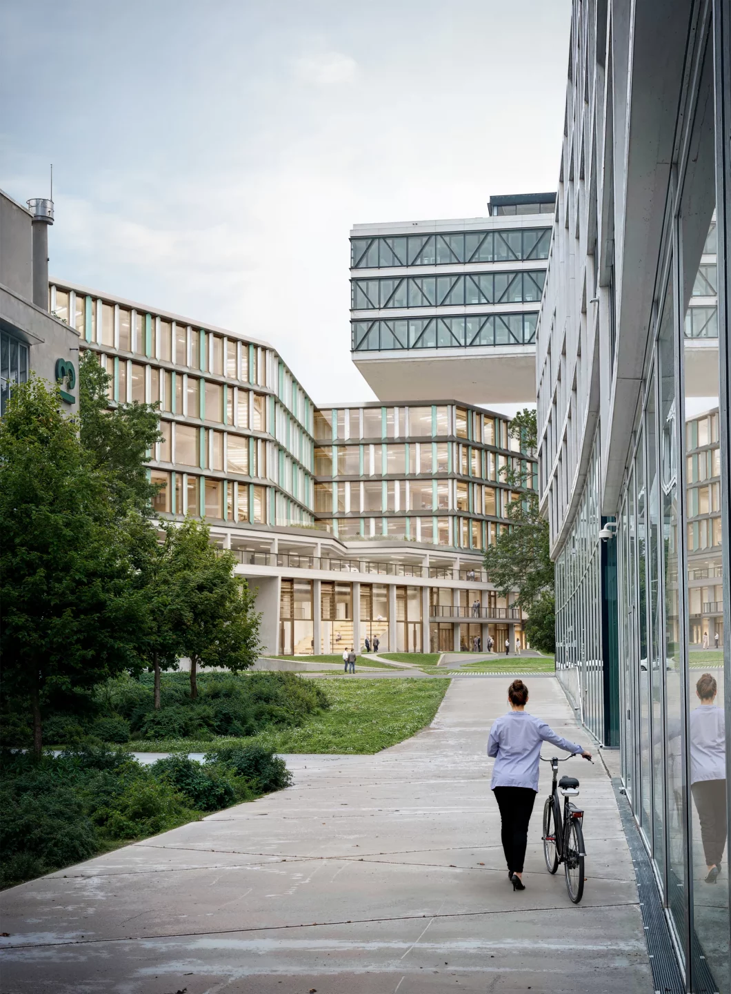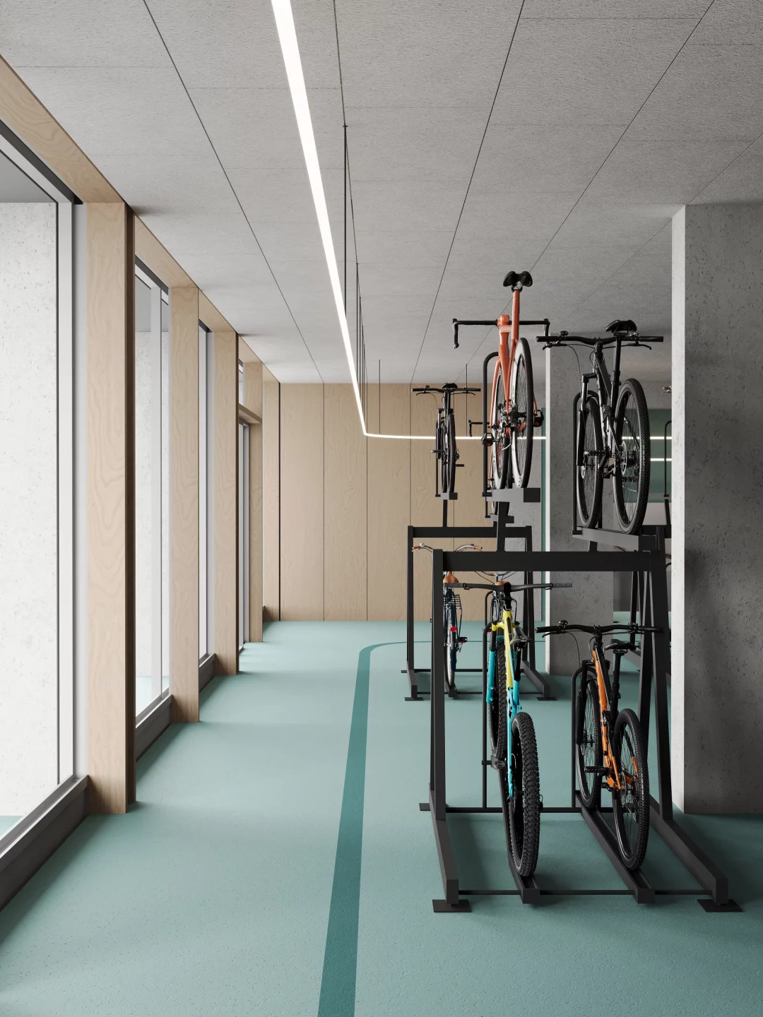 Effizient vorgefertigte Gebäudehülle Die Bürogeschosse werden mit elementierten Pfosten-Riegel-Fassaden ausgeführt, die bereits im Werk vorgefertigt sind. Im zweiten Schritt folgen die Außenschalen aus Aluminium-Gesimsen und Glaslisenen, sodass die Hülle im gleichen Takt wie der Hybridbau geschlossen werden kann. Das Erdgeschoss erhält eine klassische Aluminium-Pfosten-Riegel-Fassade. Wo immer möglich, kommen bei den Metallbauteilen recycelte Materialien zum Einsatz – für eine effiziente und ressourcenschonende Umsetzung.