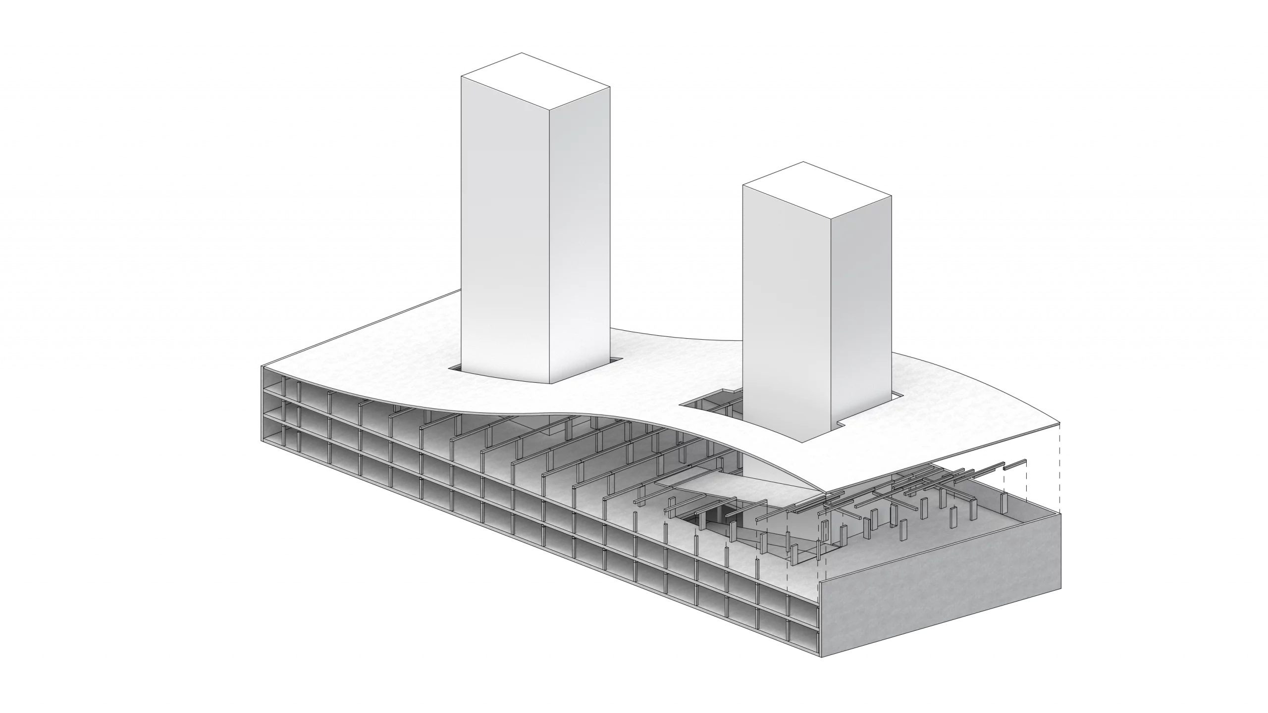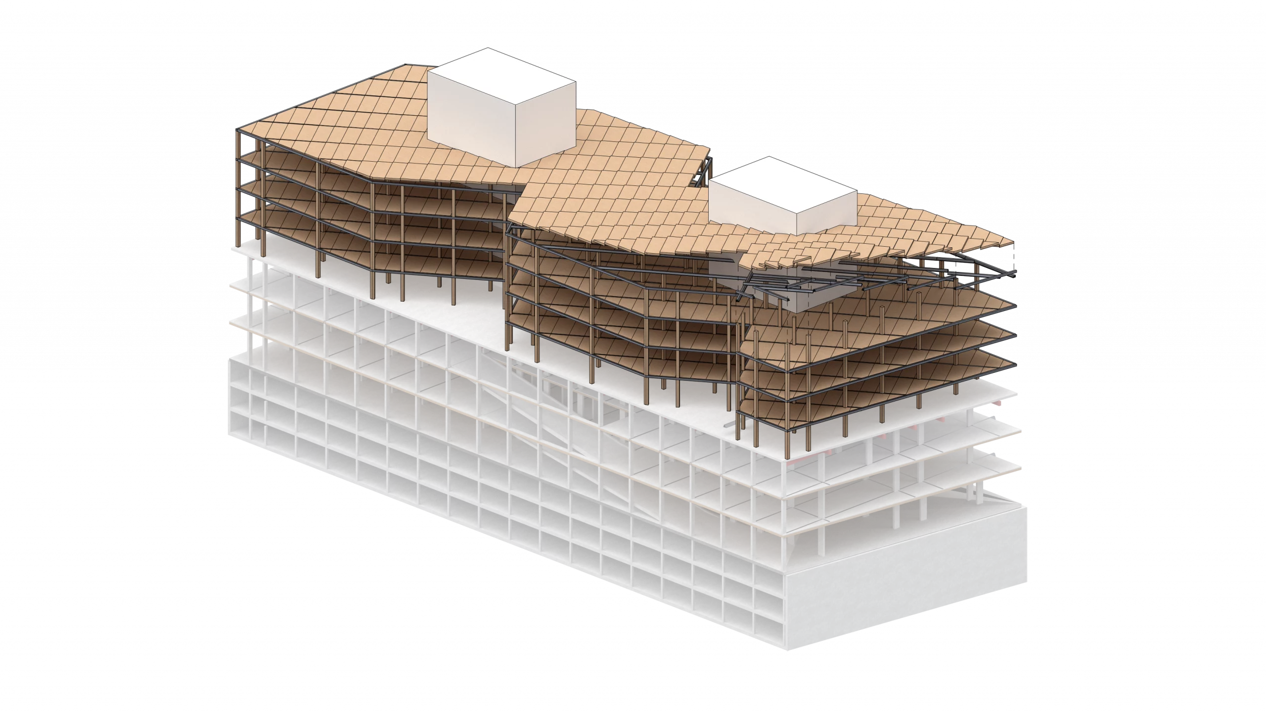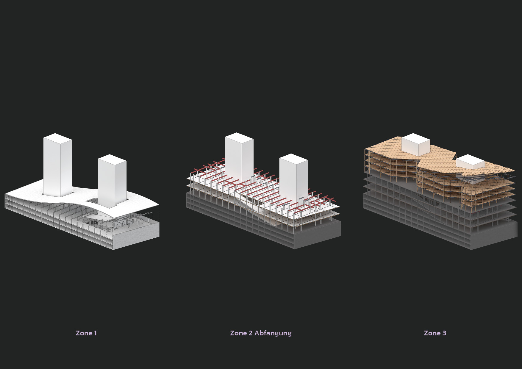 Die Konstruktion erfolgt als Hybridbau in Holz, Stahl- und Betonbauweise mit einer funktionsgerechten Materialwahl in den Nutzungsbereichen: Zwei erforderliche Untergeschosse werden in Ortbetonbauweise realisiert und dienen der Parknutzung, Erd- und 1. Obergeschoss als Park- und Gewerbefläche werden mit Betonfertigteilen und Spannbetonhohldielen errichtet. Das 2. bis 6. Obergeschoss wird als hybrider Holzskelettbau und aussteifenden Kernen in Massivbauweise realisiert. Die Kombination aus Massivholzdecken und deckengleichen Unterzügen in Stahlbetonverbundbauweise schafft offene, flexible Raumstrukturen für moderne Arbeitswelten. Der materialbedingte Rasterwechsel führt in Teilen des EG und 1.OG zu Abfangungen und Lastumleitungen. Das Gebäude ist so konzipiert, dass es schnell und effizient auf künftige Nutzungsänderungen reagieren kann. Die Rückbaubarkeit ausgewählter Bereiche wird konstruktiv bereits in der Umsetzung berücksichtigt und wird baulich umgesetzt. Der Entwurf setzt von Grund auf an auf die Nutzung nachwachsender Ressourcen zur Reduktion der CO² Emissionen, dort wo gestalterisch funktional sinnvoll. Des Weiteren liegt dabei ein Fokus zirkulären Bauweisen, die materialunabhängig, das einfache Fügen und Entfügen von Bauteilen erlaubt – als Beitrag zum Konzeptgedanken des Urban Mining und zur langfristigen Anpassungs-/Wandlungsfähigkeit.