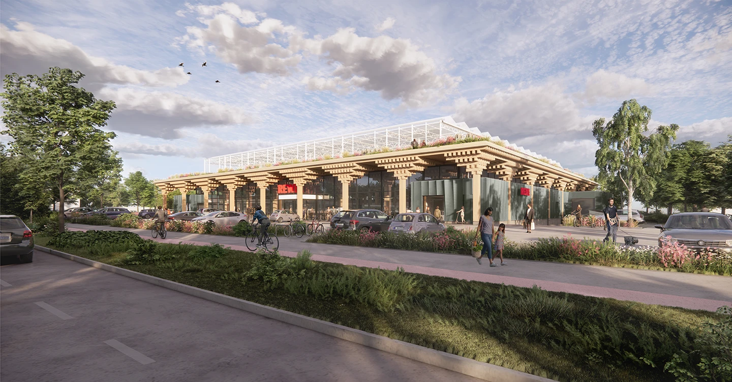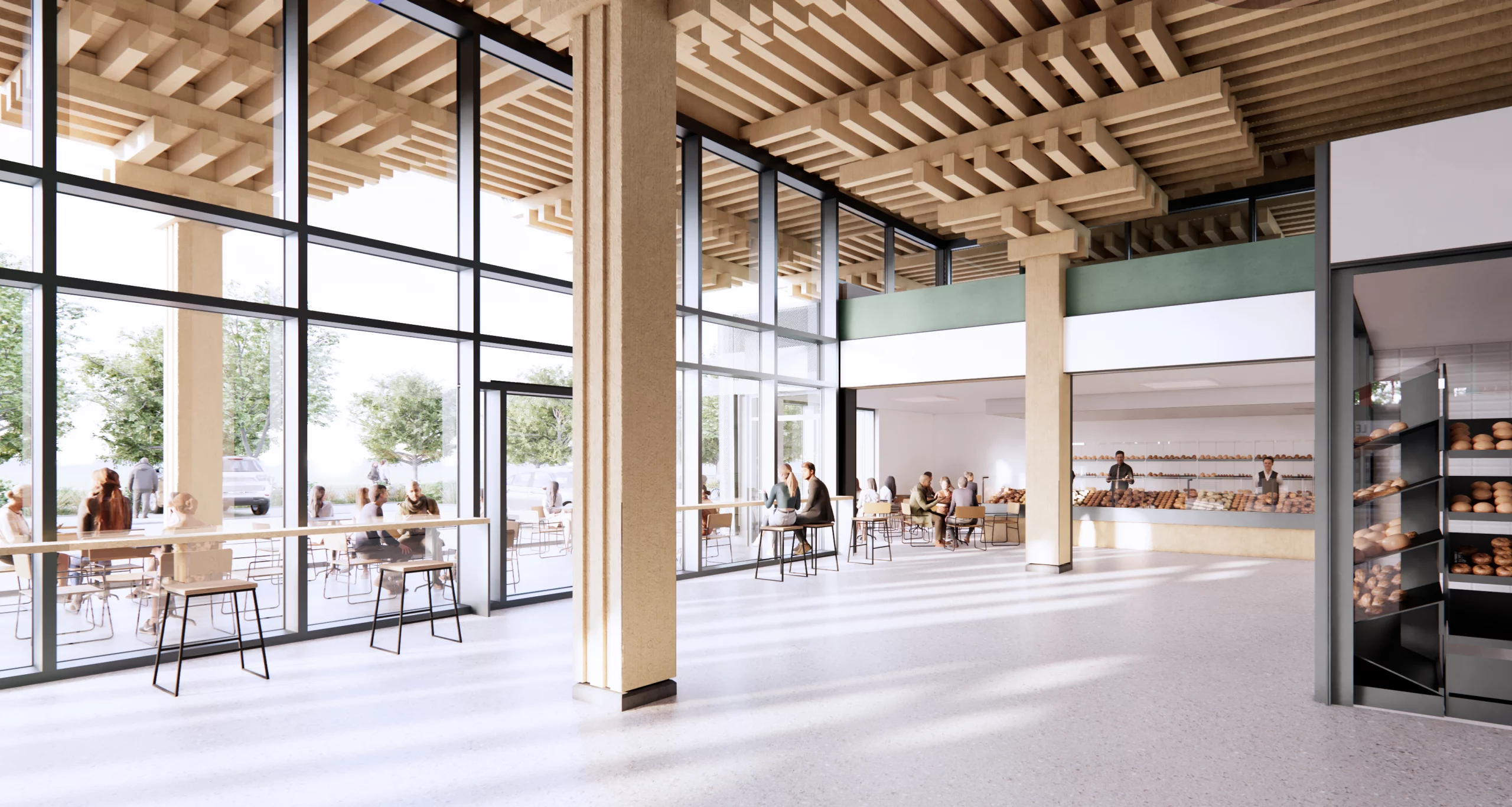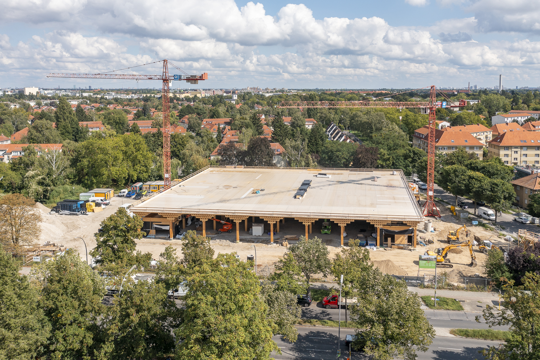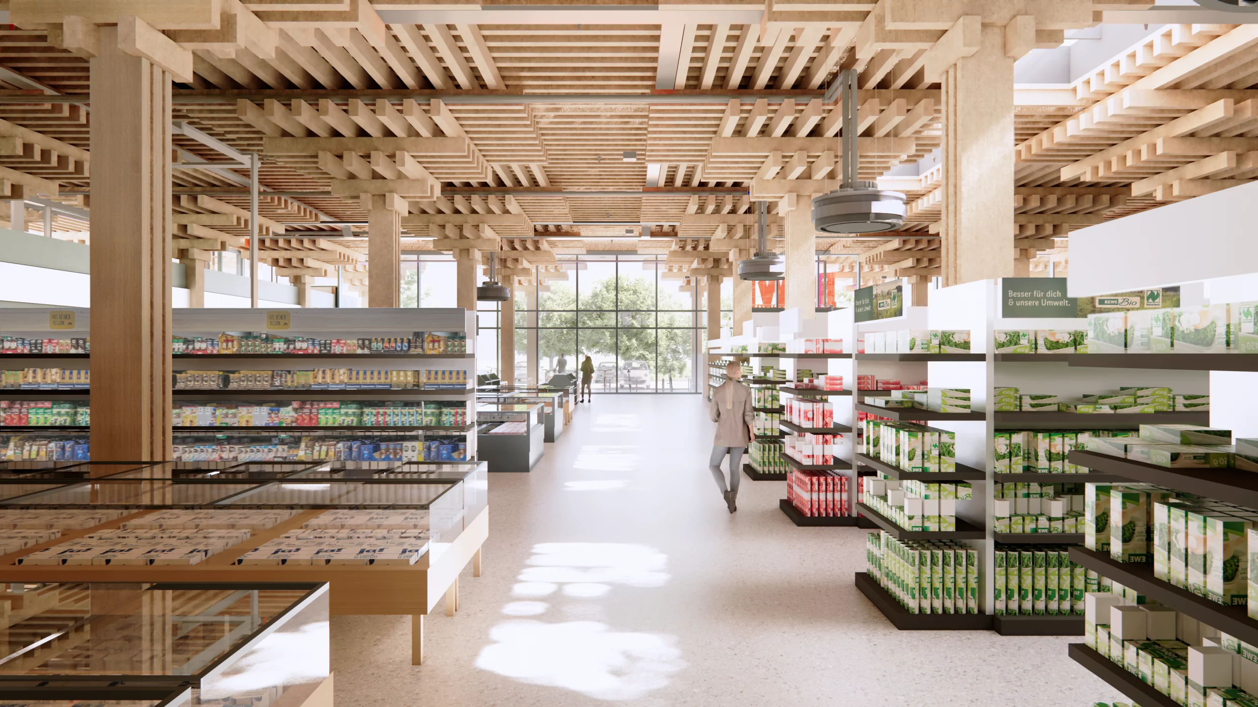 Die Tragstruktur als prägender Teil der Architektur setzt auf biogene Baustoffe, der Holzbau steht im Mittelpunkt des Einkaufserlebnisses. Das weit spannende Dachtragwerk besteht aus Brettschichtholzstützen, sieben gestapelten, miteinander verschraubten Holzbalkenlagen und einer raumabschließenden Brettsperrholzplatte, gegründet auf einer schlanken Platte in Stahlbetonbauweise. Die geometrische und konstruktive Entwicklung der Stützenköpfe folgt gestalterischen, funktionalen und baupraktischen Prämissen, die als Teil der Systementwicklung/-optimierung einen weiteren Meilenstein darstellt. Unter dem Dach verortete Nutzungsbereiche werden aus vorgefertigten Holztafelwänden und Holzrippendecken konstruiert. Die einfache Fügung- und Entfügung, damit planmäßige Wieder- und Weiterverwendung der Bauteile, ermöglicht eine zirkuläre Konzeption des Gebäudes, als Grundlage zukunftsweisender und klimabewusster Bauwerke.